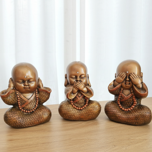 Simbolizan una invitación a vivir en armonía. Inspirados en la enseñanza de no ver, no escuchar y no hablar el mal, estos Budas nos recuerdan la importancia de elegir con intención qué pensamientos y energías dejamos entrar en nuestras vidas.
