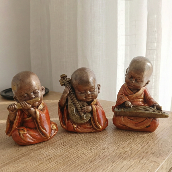 Cada pieza presenta rasgos suaves, expresiones serenas y una postura que evoca armonía y contemplación, lo que las convierte en objetos decorativos con carácter espiritual y simbólico. Su tamaño compacto permite integrarlas con facilidad en distintos espacios sin recargar la composición visual. Funcionan bien como piezas de colección, elementos de altar, decoración de escritorio, estanterías, mesas auxiliares o como complemento en rincones de relajación y meditación.